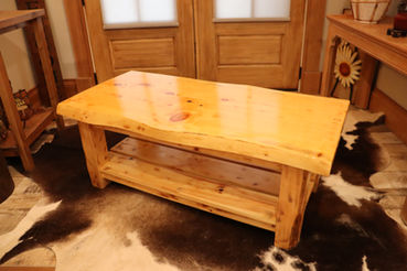 A beautiful raw wood table with a live edge top that is finished with a clear epoxy resin makes this table such a unique find. With a shelf underneath for storage, this coffee table is great for any living or rec room.